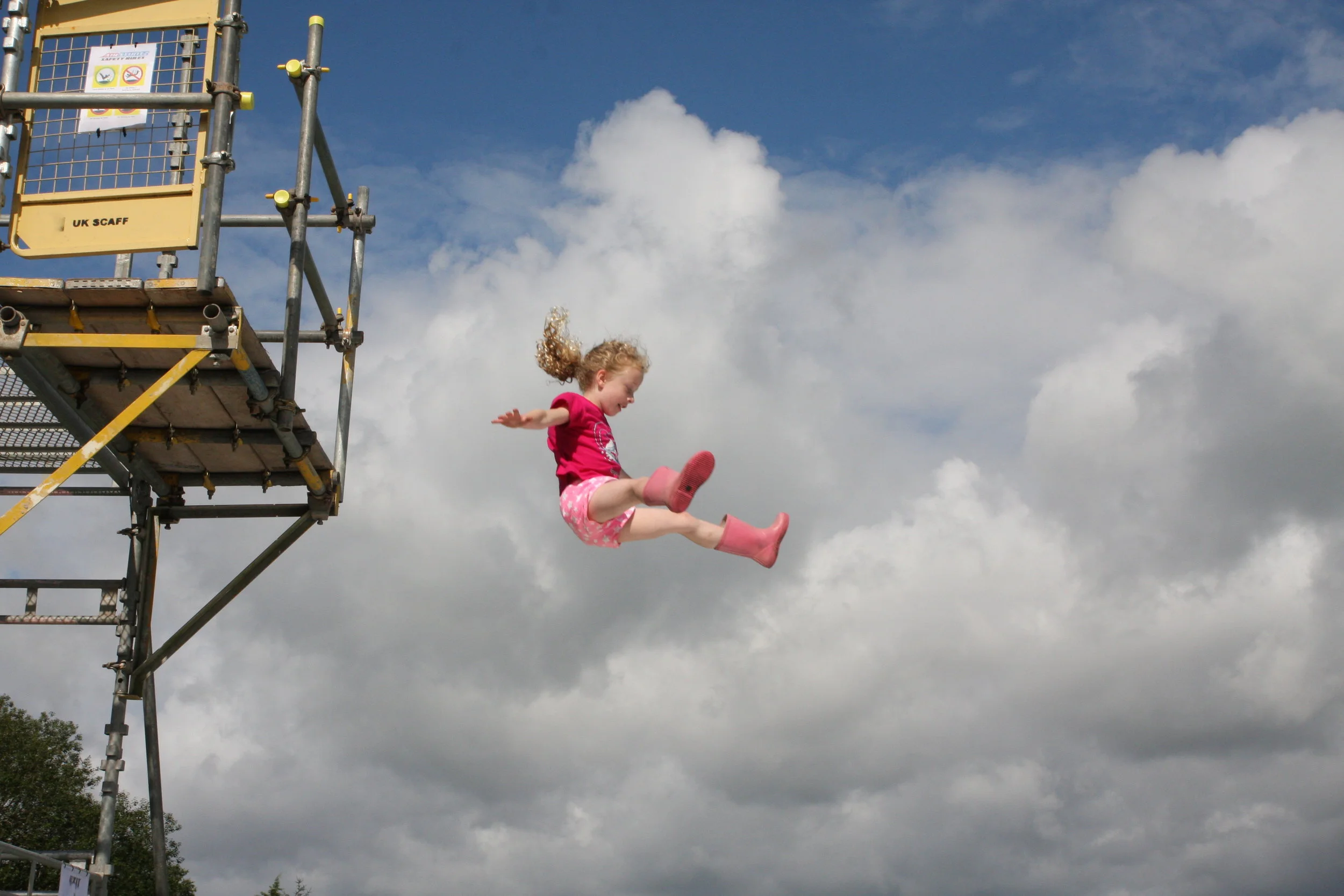 Freedrop is very simply the art of falling. There’s no water to hit hard, no painful back slaps or belly flops if you get it wrong, just pure exhilaration and the need to do it again and again. This is a real must and is a great way for young and old to gain confidence at height and in overcoming fear. Our platforms are built from highly durable steel scaffolding and we offer several platform heights to accommodate all individuals and adrenaline needs.